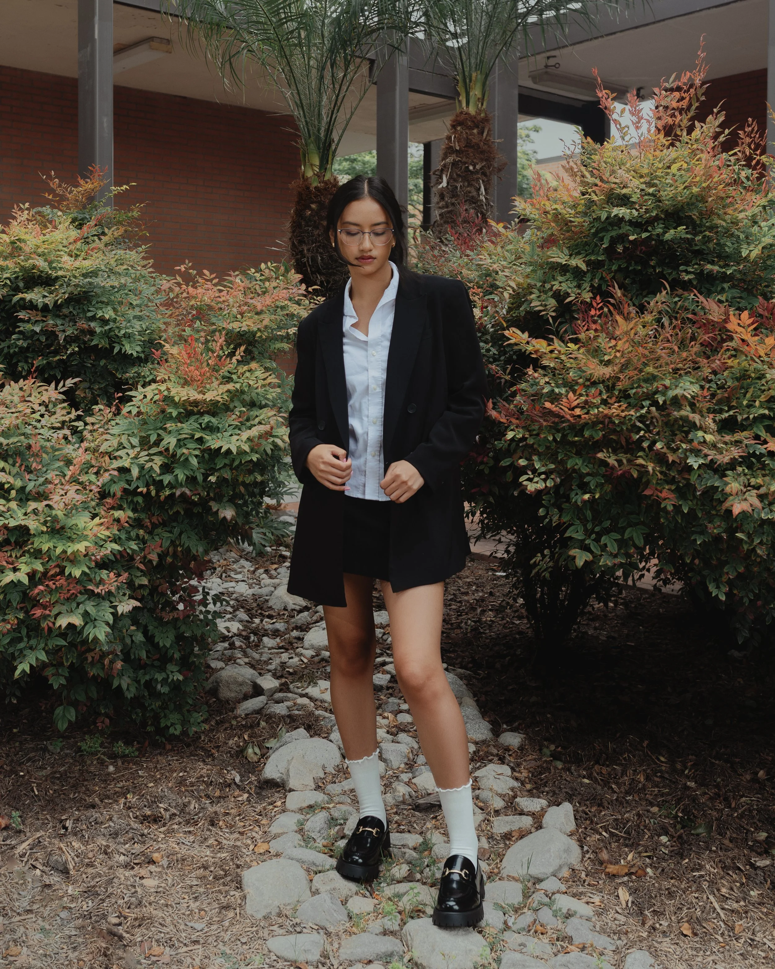 Young woman wearing a white shirt, black blazer, black skirt, white socks, and black shoes standing on a stone path among bushes and palm trees outside.
