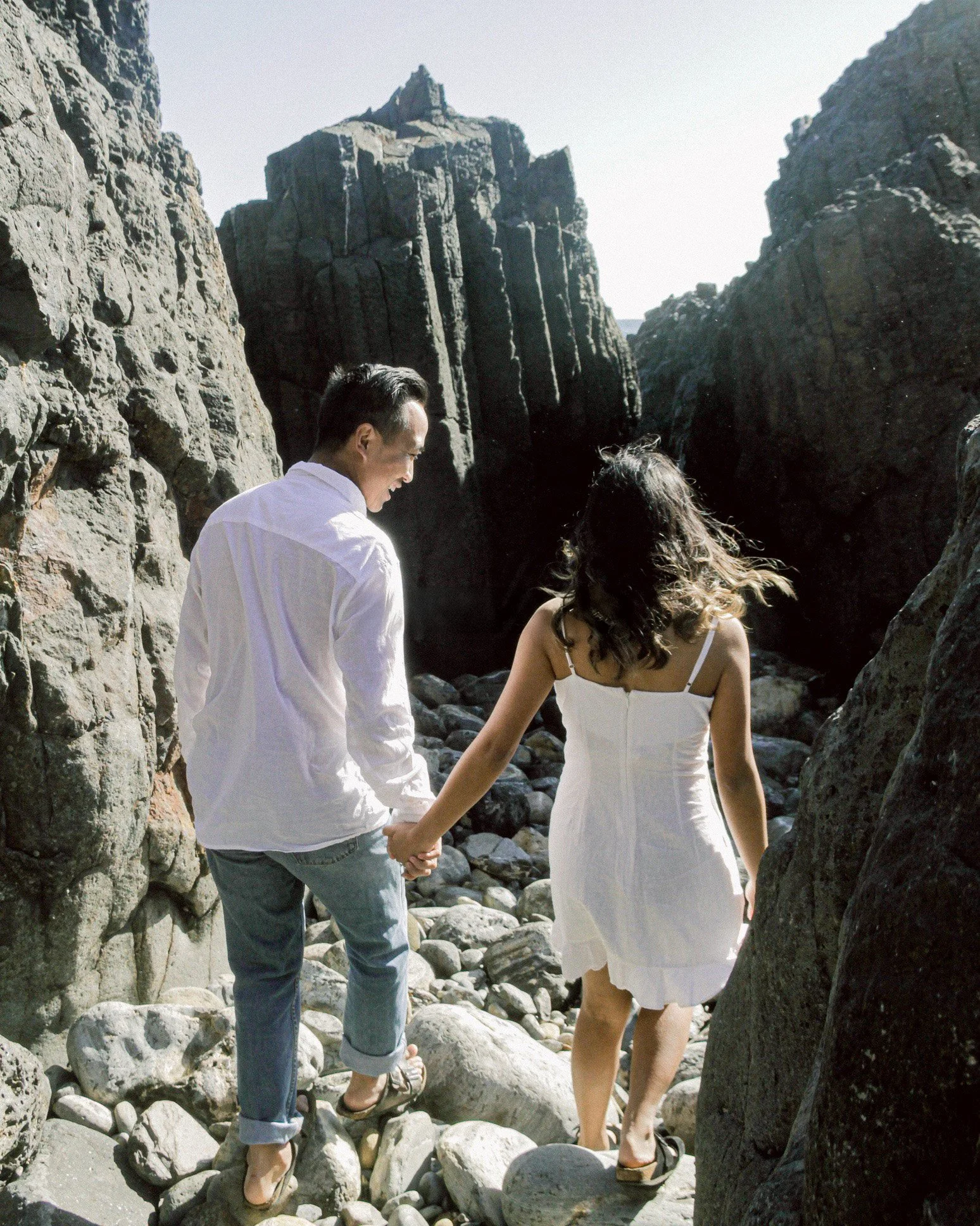 A man and woman holding hands and walking over rocks between large cliffs on a bright day.