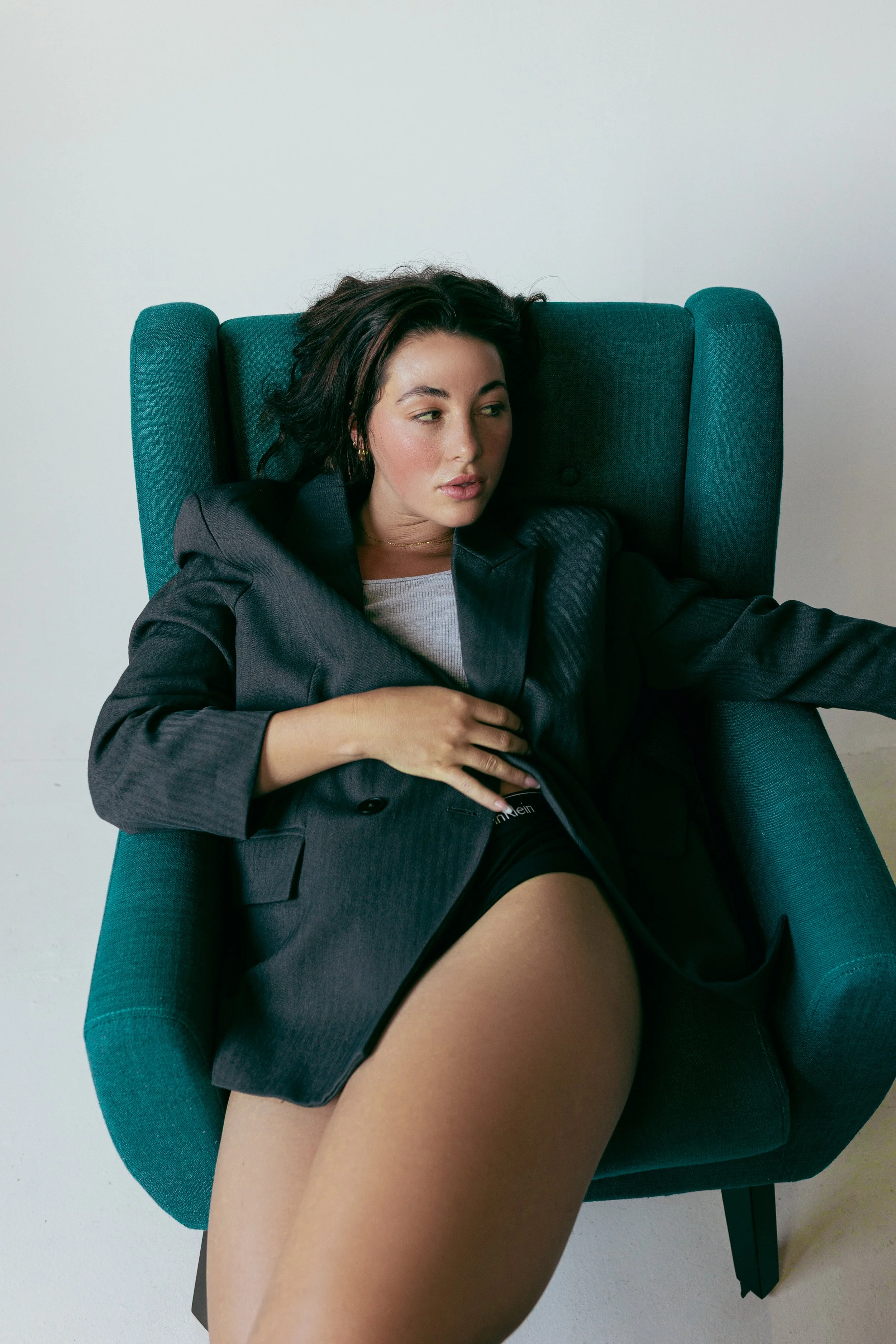 A woman reclining on a teal armchair wearing a black blazer, Calvin Klein underwear, and a cropped gray top, with her legs crossed and looking at the camera.