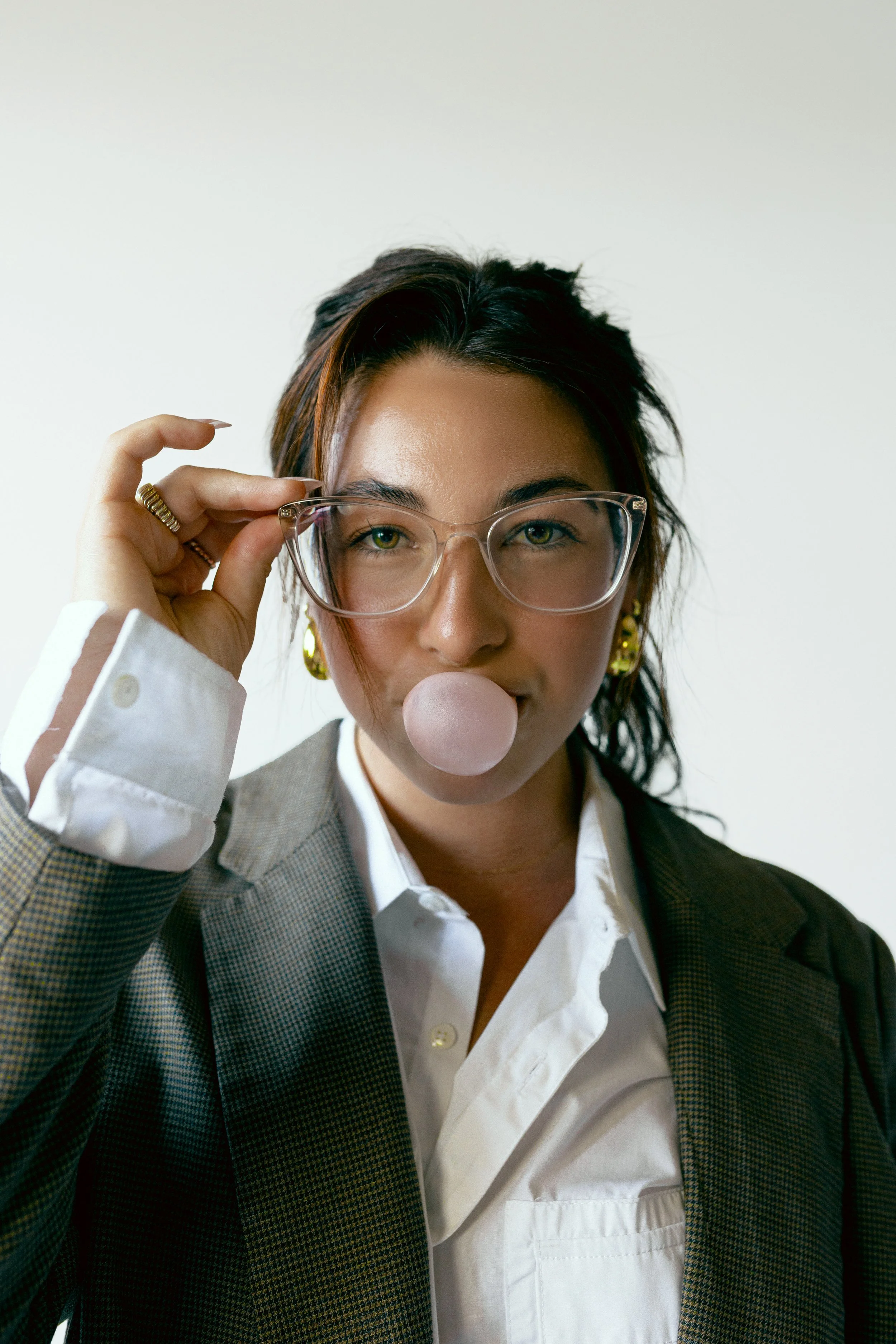 A woman with dark hair, wearing clear glasses, a white shirt, and a dark blazer, blowing a bubblegum bubble while holding her glasses.