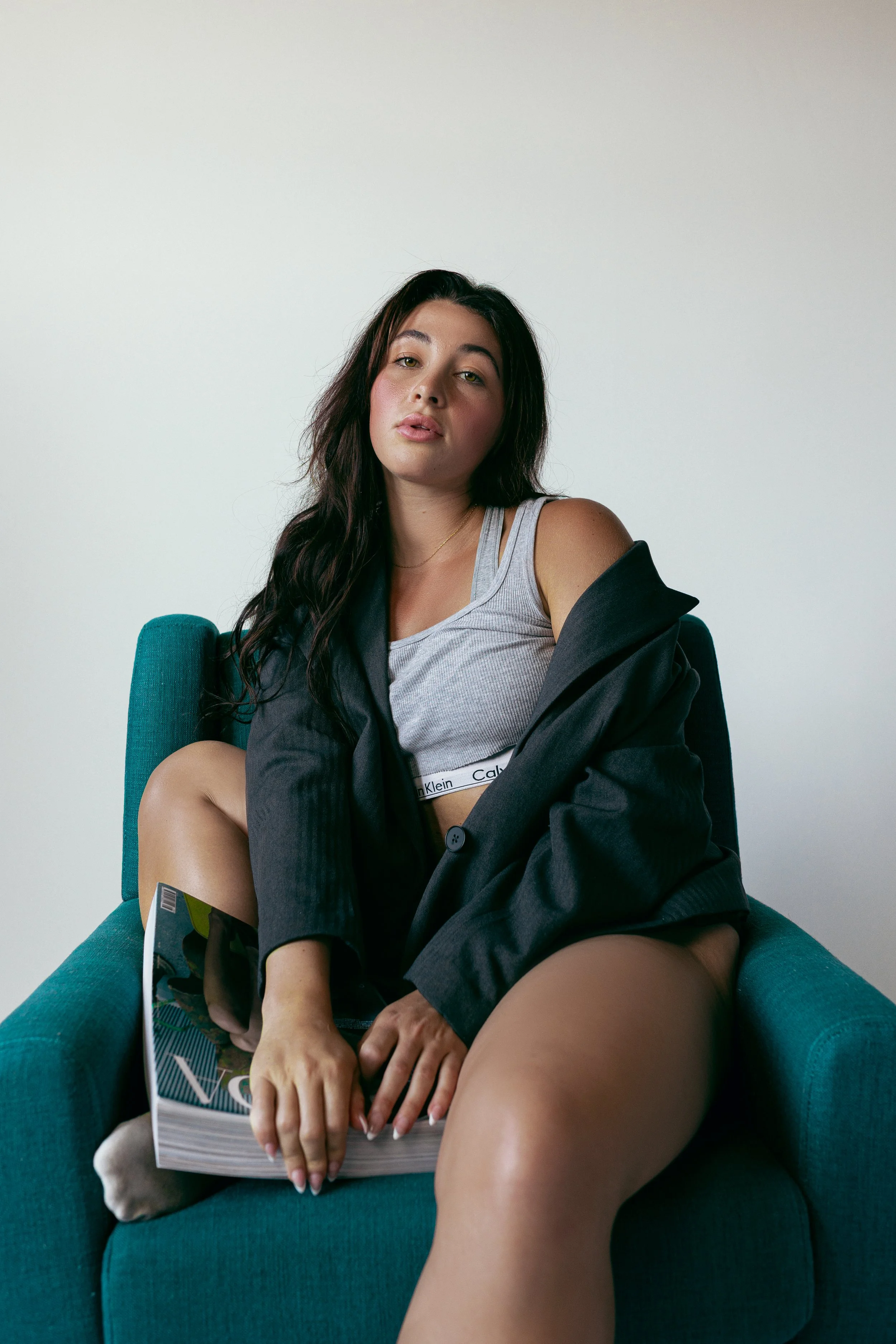 A young woman with long dark hair, sitting on a teal armchair, wearing a gray Calvin Klein sports bra, gray tank top, and a black jacket draped off her shoulders, holding a magazine in her lap.