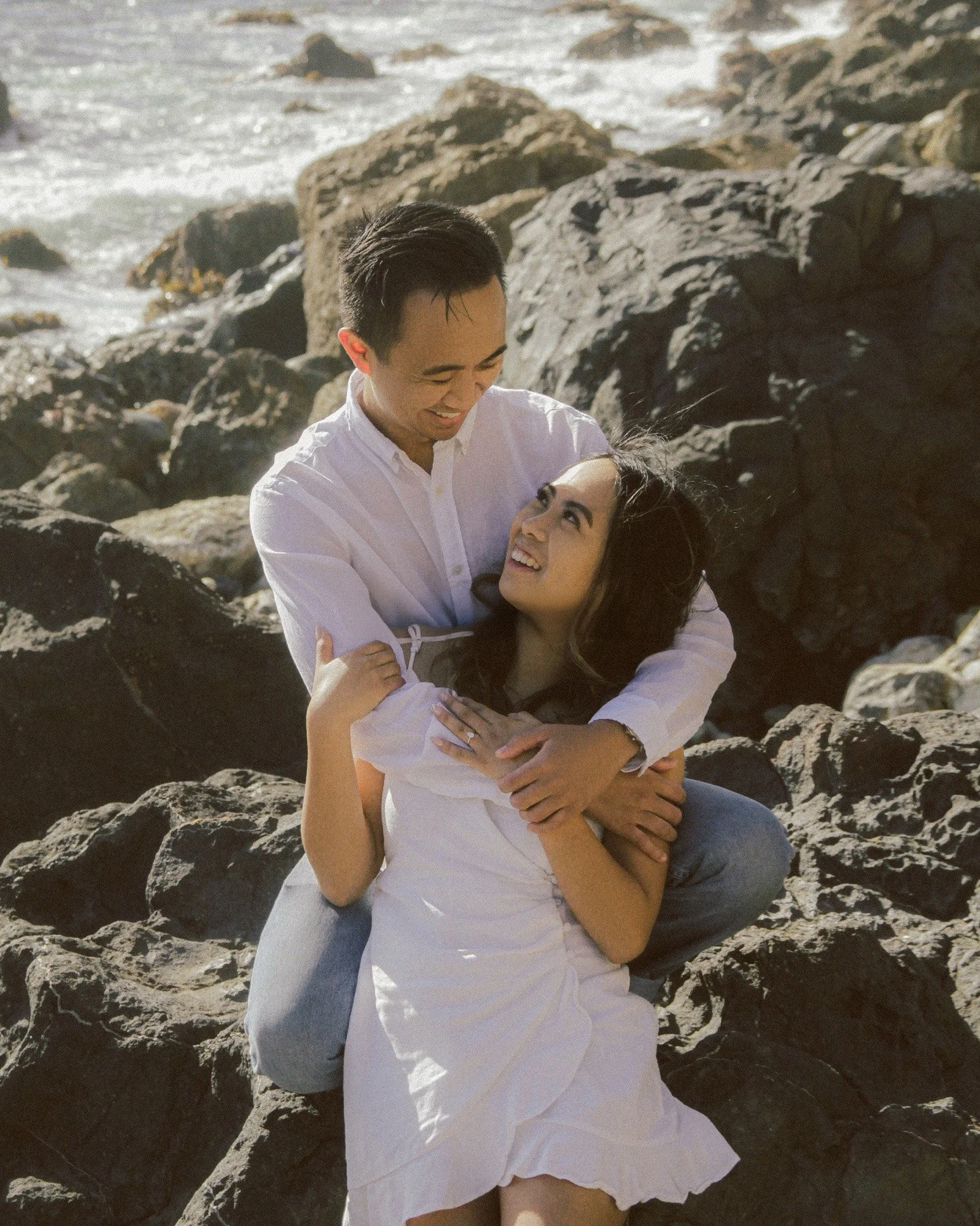 A couple sitting on rocks by the ocean, smiling and embracing each other during sunset.