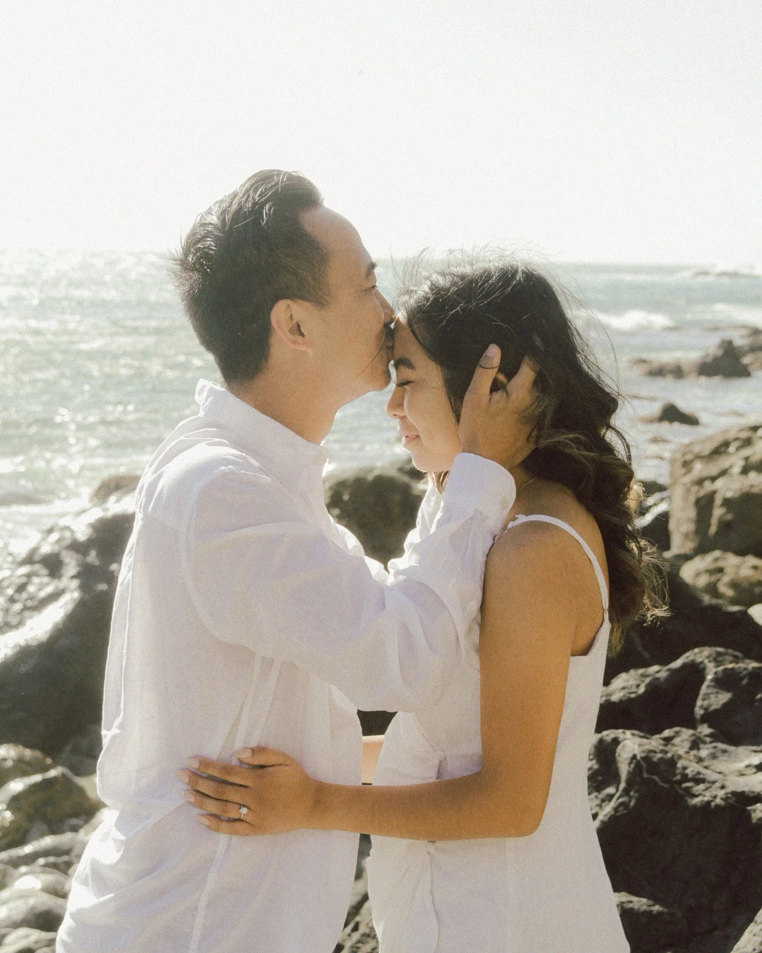 A couple standing on rocks by the ocean, embracing affectionately, with the man kissing the woman's forehead.