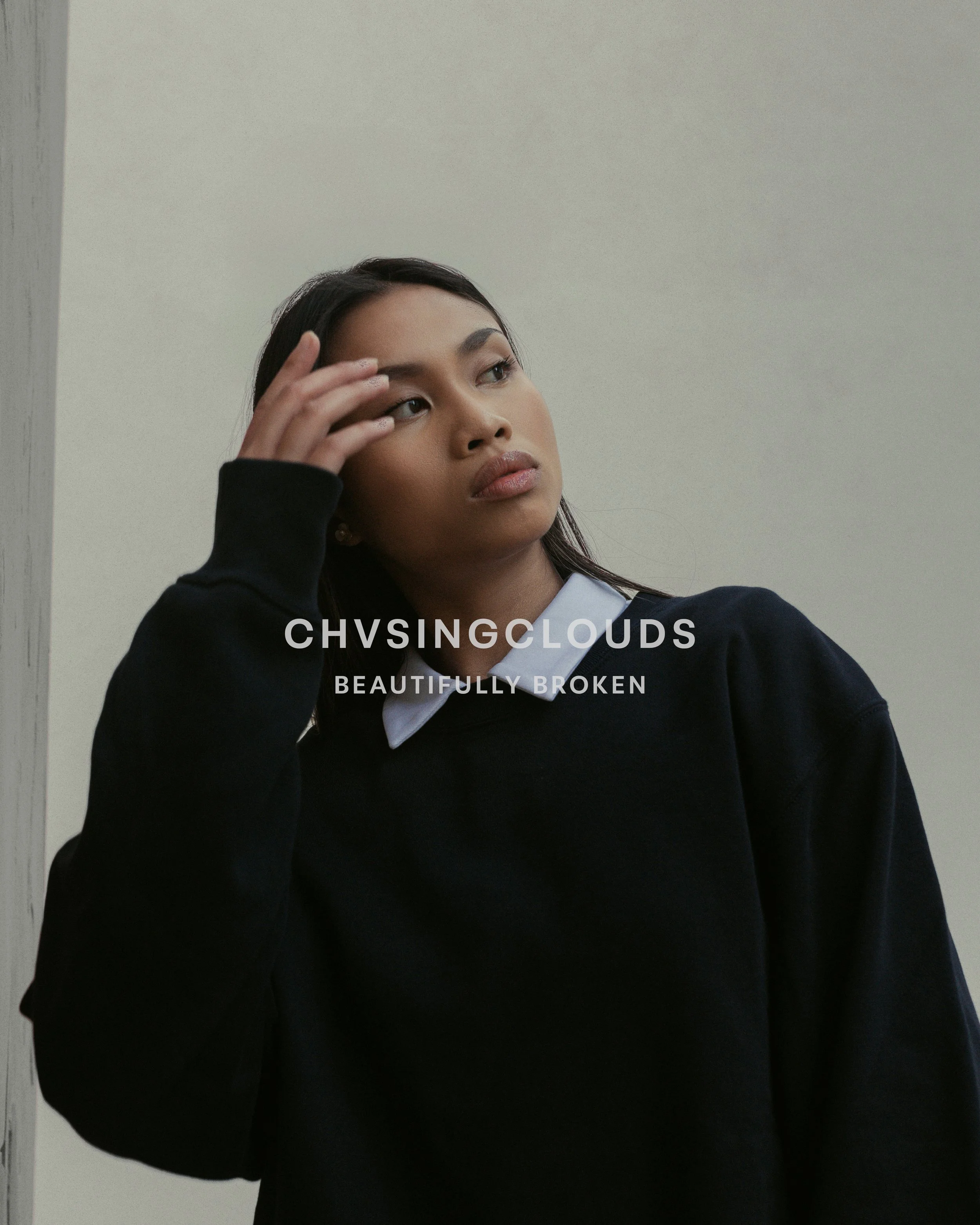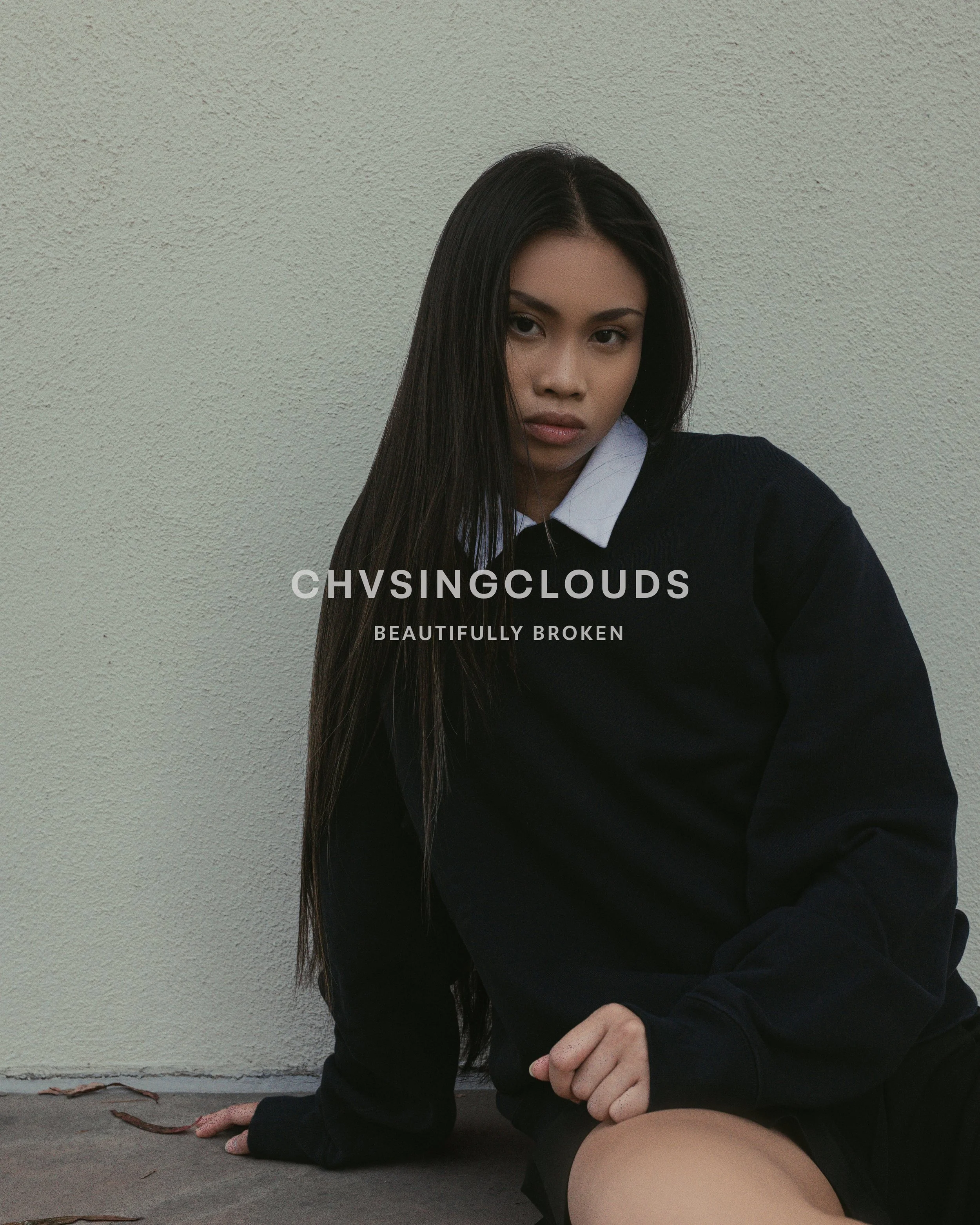 Young woman with long dark hair wearing a black sweater and white shirt sitting against a light-colored wall with text "CHVISINGCLOUDS" and "BEAUTIFULLY BROKEN" overlaid.