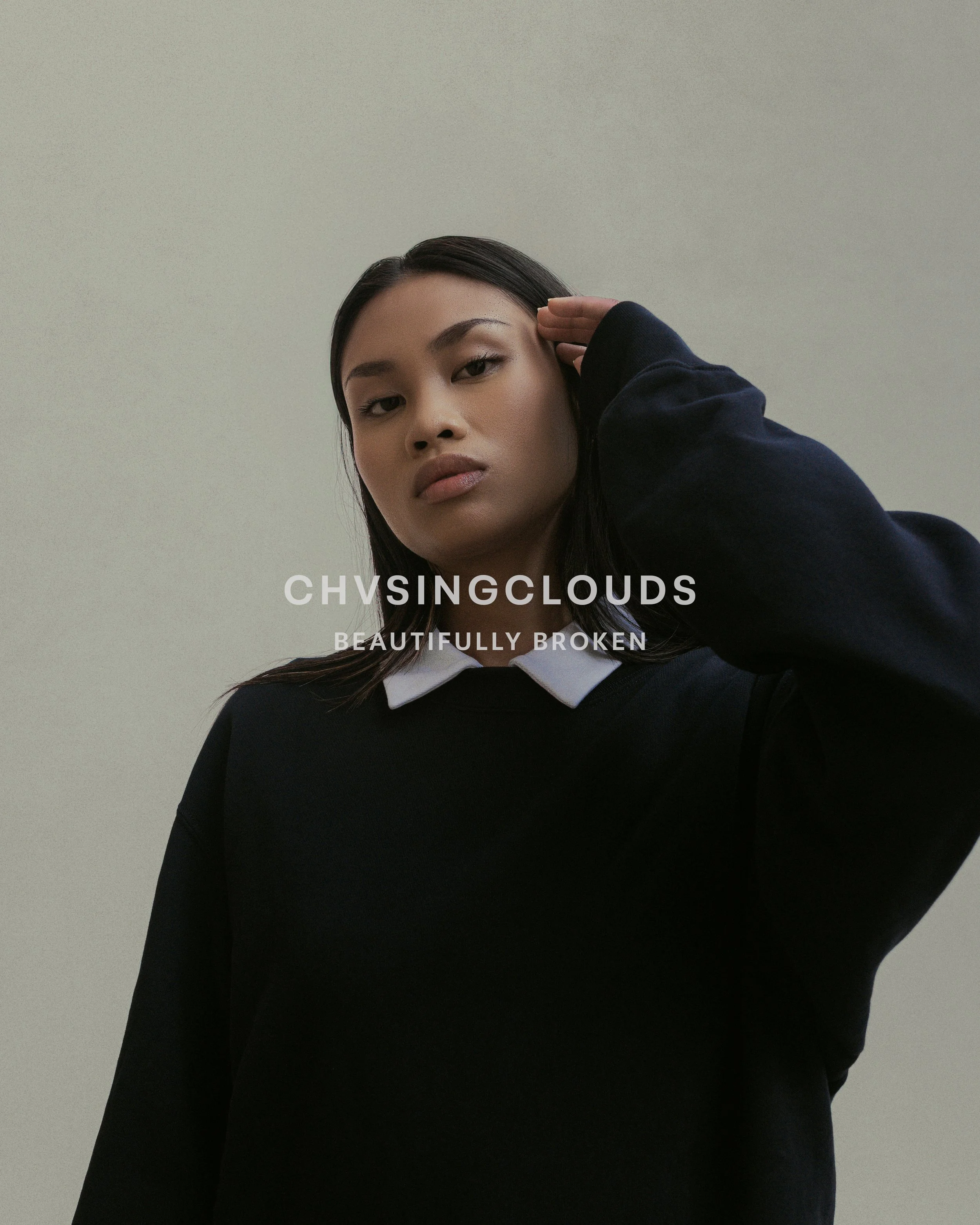 A woman with long dark hair, wearing a black sweatshirt with a white collar, poses against a plain green background. The text "CHVSINGCLOUDS" and "BEAUTIFULLY BROKEN" overlays the image.